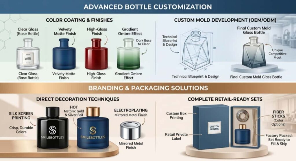 Define Your Target Market: Are you selling to budget-conscious shoppers in big-box stores, or are you aiming for high-end boutique shoppers? If you are targeting the luxury market, you must invest in heavy-base glass, custom spray colors, and heavy metal collars. Searching for luxury diffuser bottles wholesale partners like Smilebottles will give you direct access to the premium molds and finishes required to impress this demanding demographic.