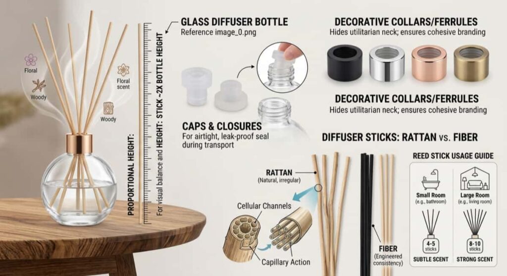 A standard glass diffuser setup is straightforward but highly effective. It consists of the glass vessel, the fragrance oil, the decorative collar or cap, and the porous sticks. Because this process is entirely natural and requires zero heat, the chemical composition of your fragrance remains unaltered. This provides a pure, consistent, and safe scent profile over weeks or even months. For your buyers, this means a reliable, low-maintenance way to scent their homes, offices, or commercial spaces.