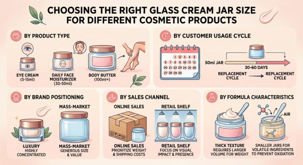 Selecting the right size is not a guessing game. You need to align the jar’s capacity with your product’s purpose, your brand identity, and your customers’ habits. When you are looking for glass jars for face cream or body lotions, consider these angles: