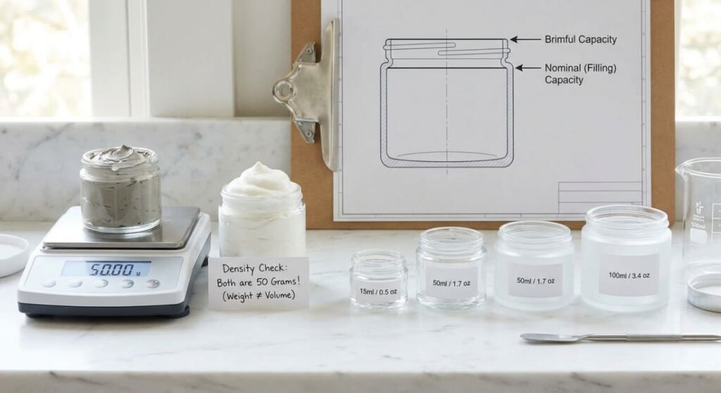 A common point of confusion for buyers is the difference between grams (weight) and milliliters (volume). Cream jars are usually categorized by volume. However, because cosmetic formulas have different densities, 50ml of a light, whipped face cream will not weigh the same as 50ml of a dense, heavy clay mask. Therefore, a 15 gram cream size might actually require a 20ml jar depending on how fluffy your formula is. Always request samples and do a real-world filling test with your specific formula rather than assuming 1 gram equals 1 milliliter.
