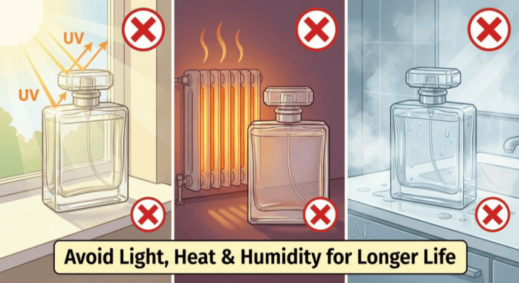 Heat: Does heat ruin perfume? Absolutely. It accelerates the chemical breakdown of top notes, making the scent smell “off” quickly.