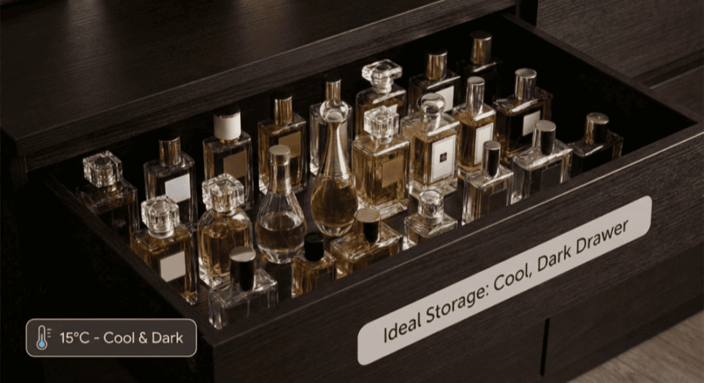 Light is the number one killer. Best way to store perfume? In its original box, inside a drawer. If you display your bottles, keep them out of direct sunlight. A perfume long bottle looks great on a vanity, but if that vanity is near a window, the scent will degrade in months.