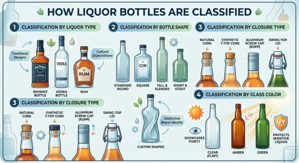 Before diving into specific spirits, it helps to understand how the packaging industry categorizes different types of bottles. Generally, manufacturers and buyers classify these containers in a few primary ways: