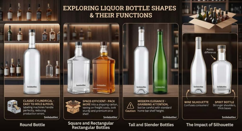 Beyond the type of spirit, you must consider the physical geometry of the glass. The glass bottle shapes you choose impact everything from shelf visibility to shipping costs. Let’s look at the specific bottle shape names and their practical functions.