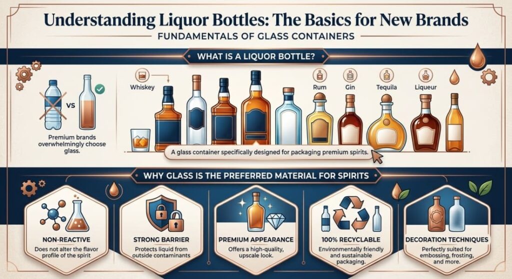 Quite simply, it is a glass container specifically designed for packaging spirits such as whiskey, vodka, rum, gin, tequila, and liqueurs. While plastic is sometimes used for cheaper, high-volume products, premium brands overwhelmingly choose glass.