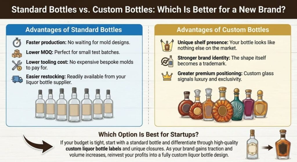A2:Startups with limited budgets should begin with standard bulk liquor bottles and use creative labeling to stand out. Brands with higher initial capital can opt for custom molds to secure an immediate, unique market presence.