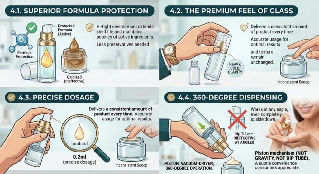 Because the system relies on vacuum rather than gravity, airless bottle cosmetic designs often work upside down or at an angle. This is a subtle convenience feature that consumers appreciate, even if they don’t consciously notice it.