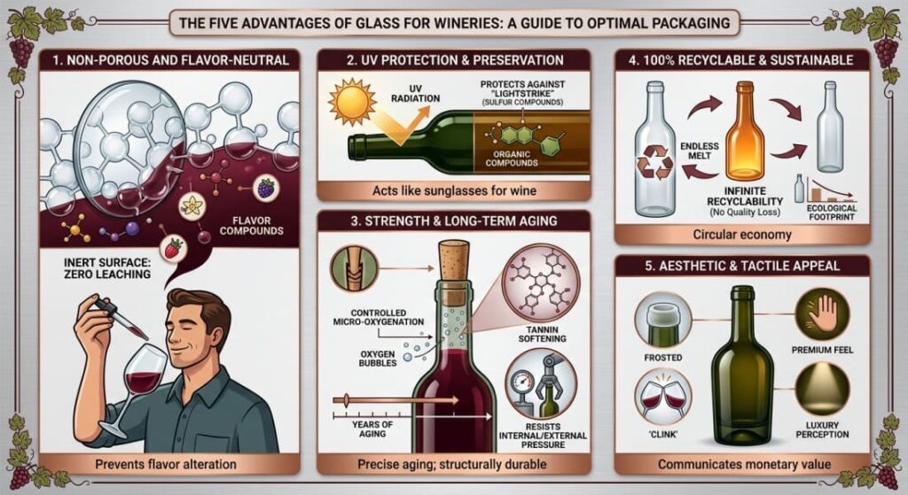 Glass is a completely non-porous and inert material. Unlike plastic, aluminum coatings, or wood, it does not chemically interact with the liquid inside. When your winemaker spends years perfecting a flavor profile, the last thing you want is for the packaging to alter its taste. Your packaging ensures that the consumer tastes exactly what you intended, with zero chemical leaching.