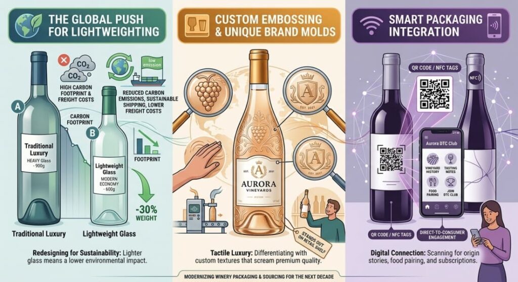 We are also seeing a rapid rise in seamless integration between classic manufacturing and modern digital technology. Clean, minimalist packaging designs are frequently being fitted with QR codes or NFC (Near Field Communication) tags integrated directly into the label or the closure shrink-wrap. This allows consumers to scan the product with their smartphones to learn about the vineyard’s history, read tasting notes, pair foods, or join a direct-to-consumer subscription club.