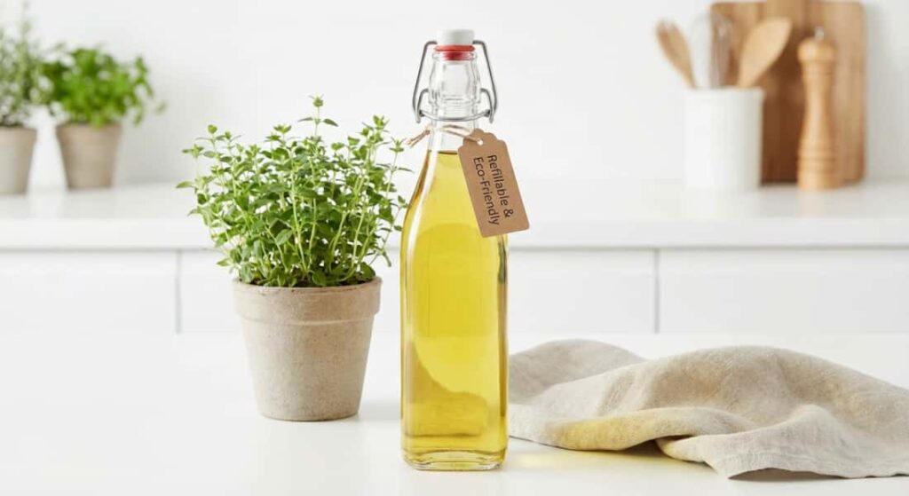 Aesthetics: A glass oil bottle with stopper looks premium on a dining table or vanity.